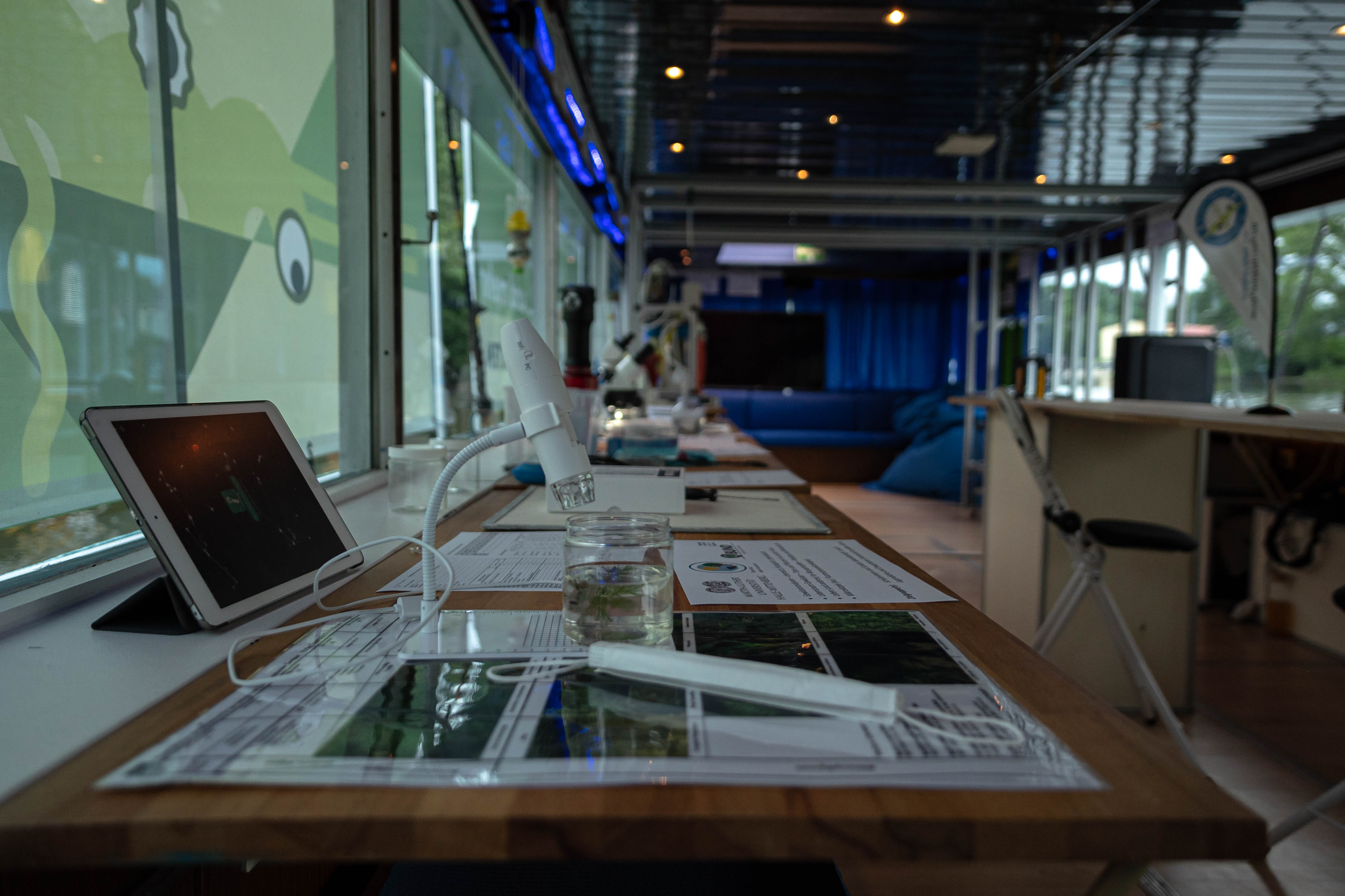 Ob Expeditionsfahrten auf der Saale, Workshops oder Events – Wissensvermittlung und Austausch sind an diesem Begegnungsort im Fluss. Regelmäßig öffnet die Bordtür und lädt etwa zum Basteln mit Algengarn und Fischleder oder zur Arbeit am Mikroskop ein. Am Oberdeck flimmert im Sommer das Open-Air-Kino oder es finden Vorträge und Talk-Runden statt.
