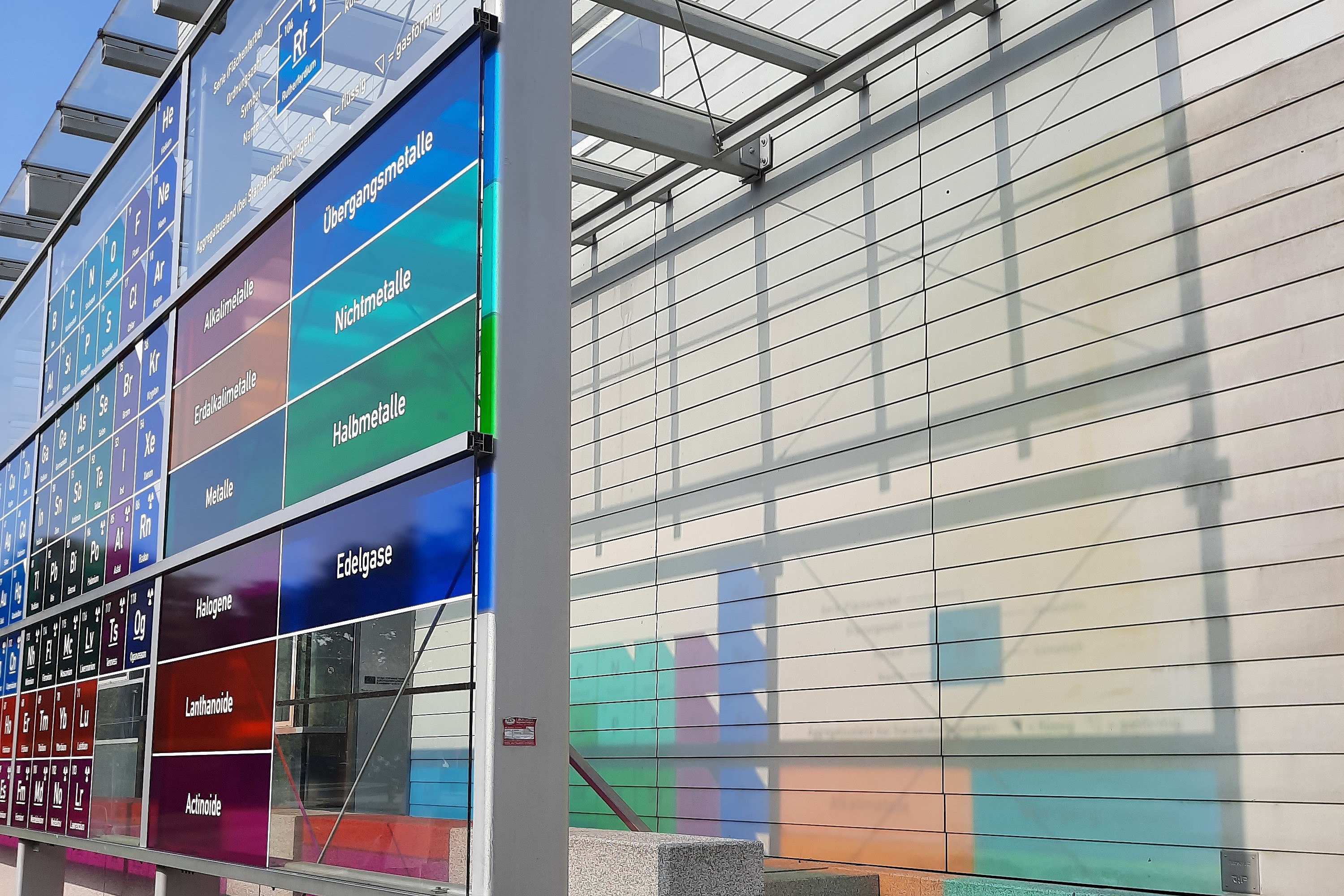 Das Periodensystem in Übergröße lädt zum Chemieunterricht im Freien ein. Wer sich nicht nur für die Theorie, sondern auch für die praktische Anwendung interessiert, für den organisiert das Team des Technologiepark Weinberg Campus auf Anfrage gerne auch eine Labor-Führung bei einem der Unternehmen am Campus.